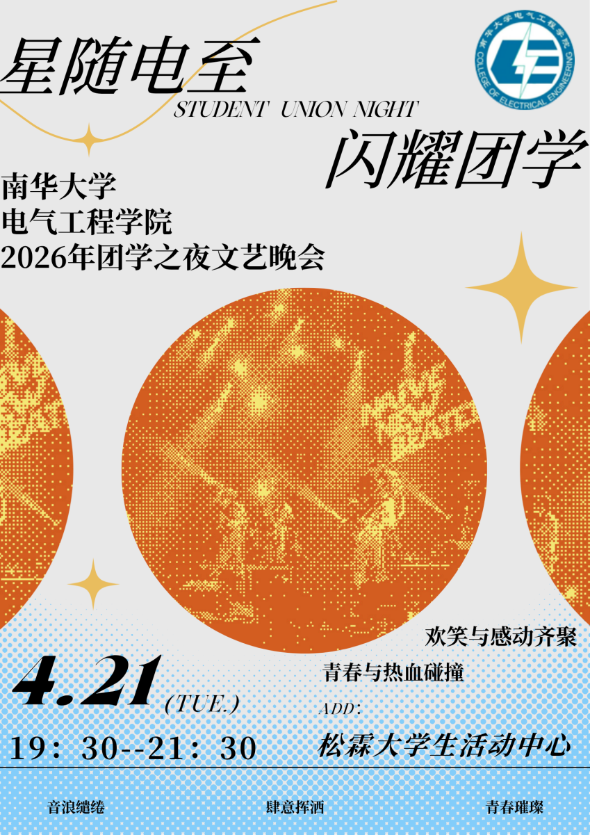 我们已搭建好最璀璨的“回路”,只待你的到来,为这一夜注入最澎湃的“电流”。4月21日晚,让我们以星为引,以电为媒,在雨母的夜色里完成一次青春的最强放电,让“星随电至”的光芒,照亮属于电气人的浩瀚苍穹。我们在松霖活动中心,静候每一个携光而来的你。
